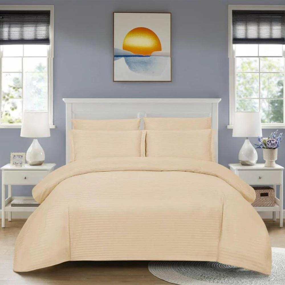 أضف لمسة من الرقي والراحة إلى غرفة نومك مع مفرش فندقي دالما المفرد ونص المكون من 5 قطع، المصمم بجودة عالية ليضمن لك نومًا هنيئًا.